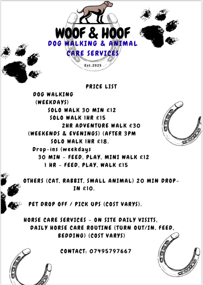Contact us to schedule a walk/visit to give your furry friend the exercise, care & happiness they deserve.www.woofandhoof.co.uk